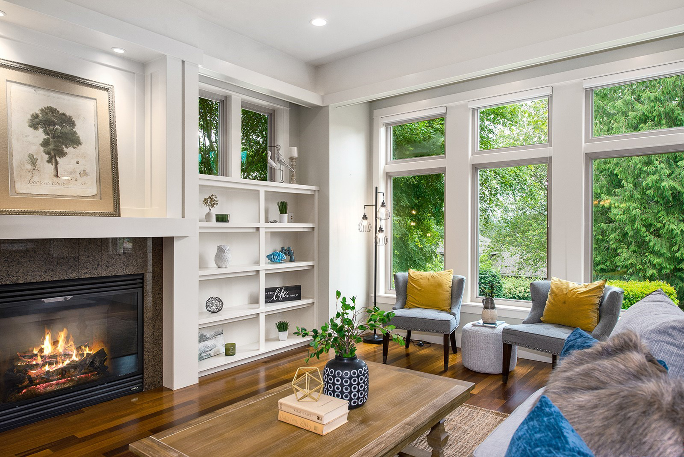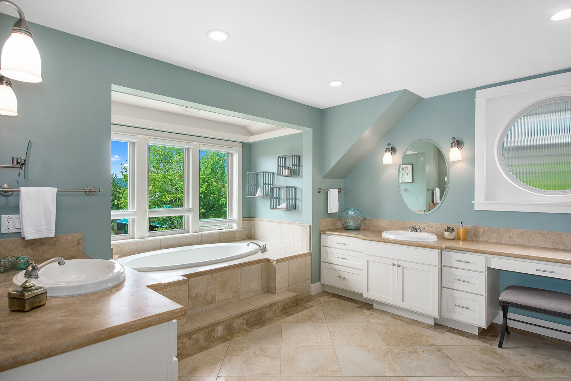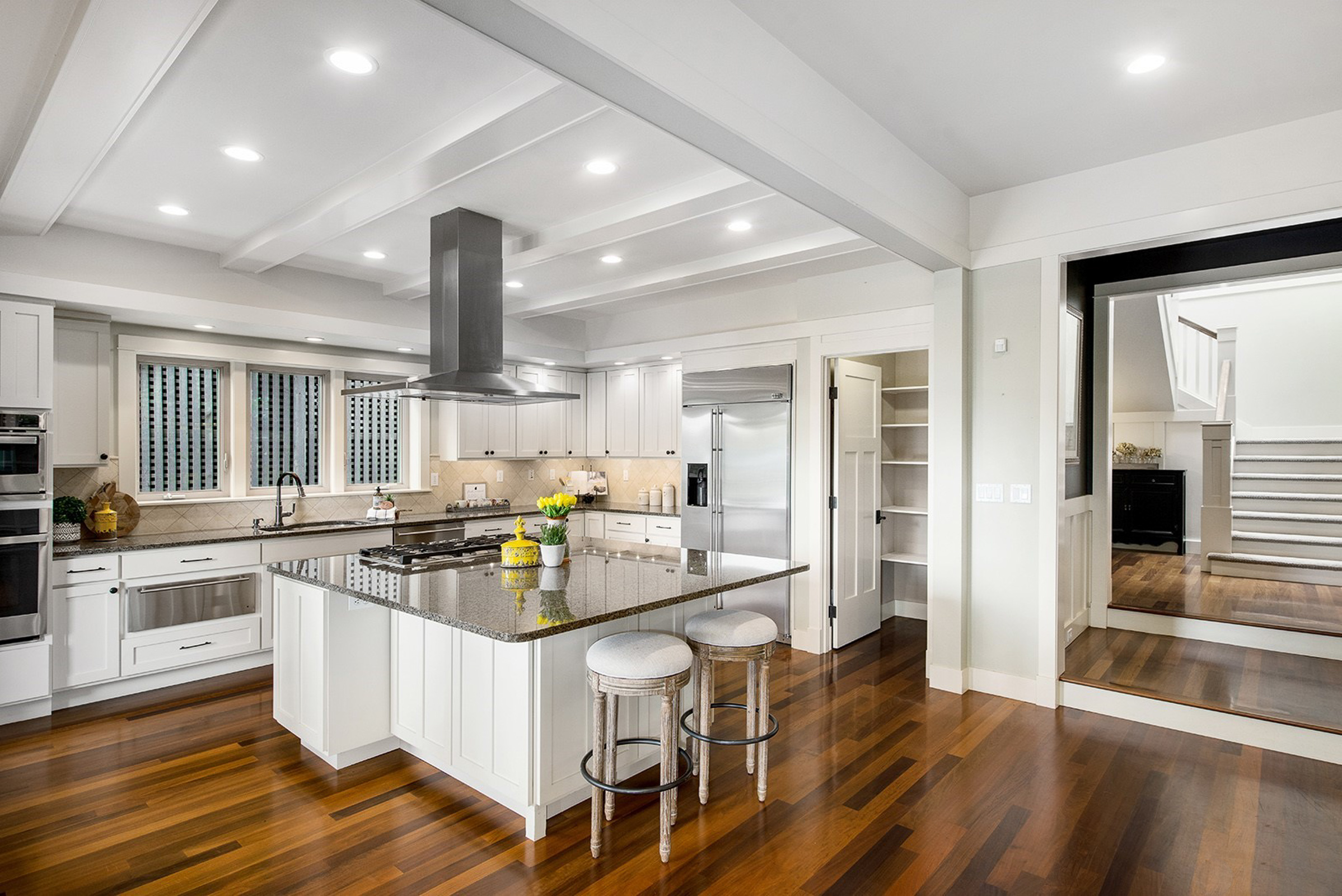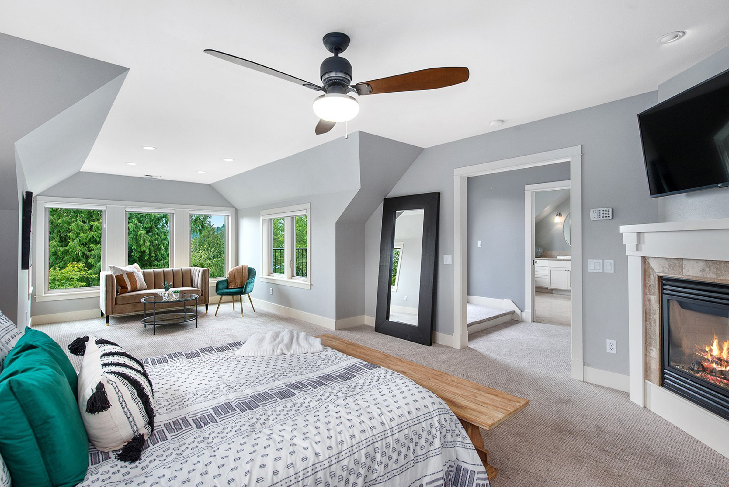 The open chef’s kitchen and adjoining living spaces are designed for gathering, while the private primary suite enjoys its own fireplace, balcony, and spa-inspired bath. Outdoor living extends to a covered deck and patio with fireplace, creating inviting spaces to relax just minutes from Juanita Village, waterfront parks, and scenic trails.