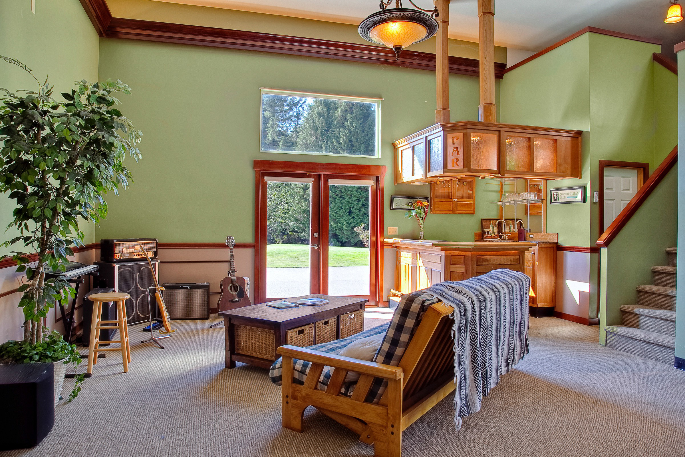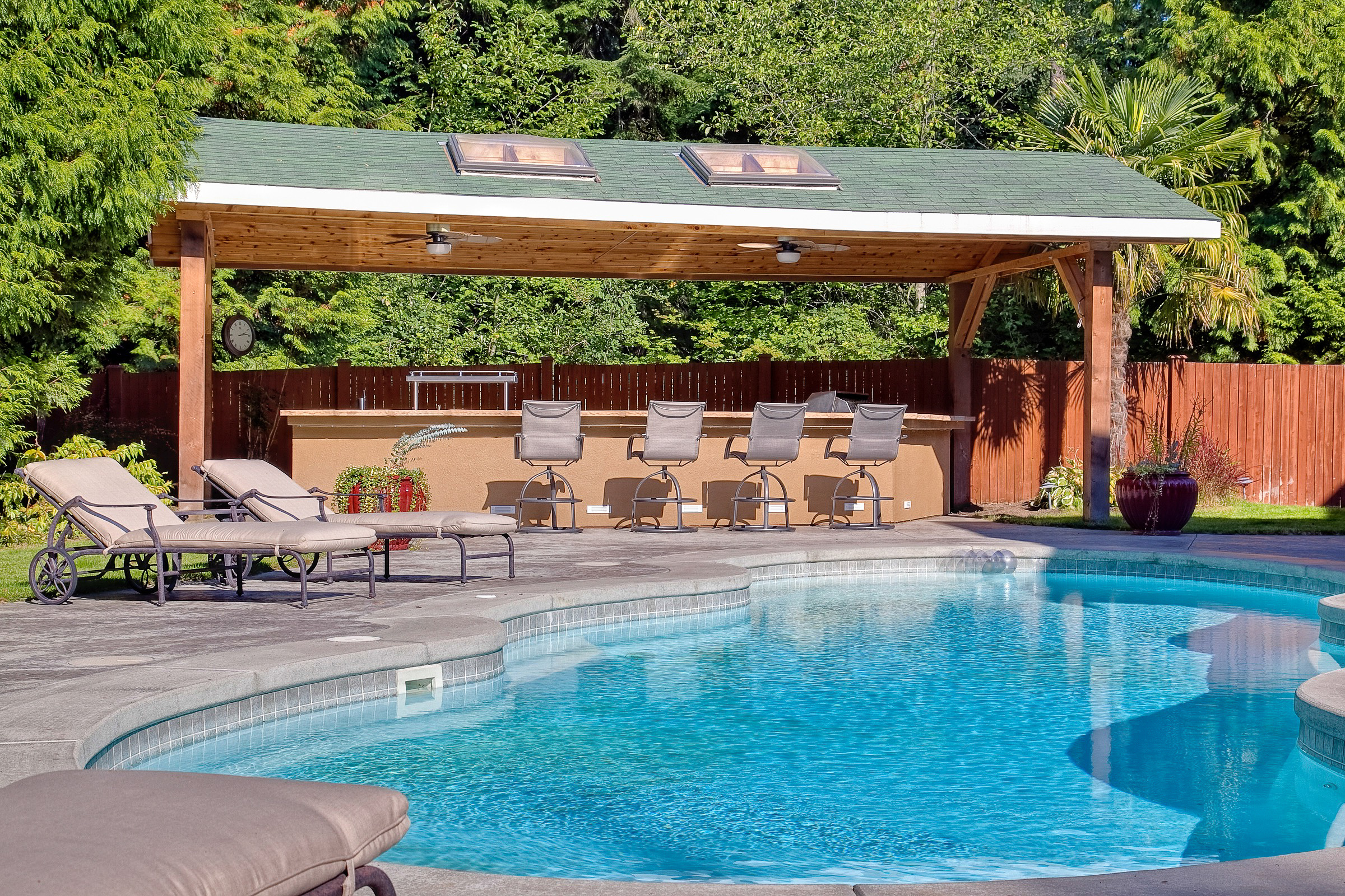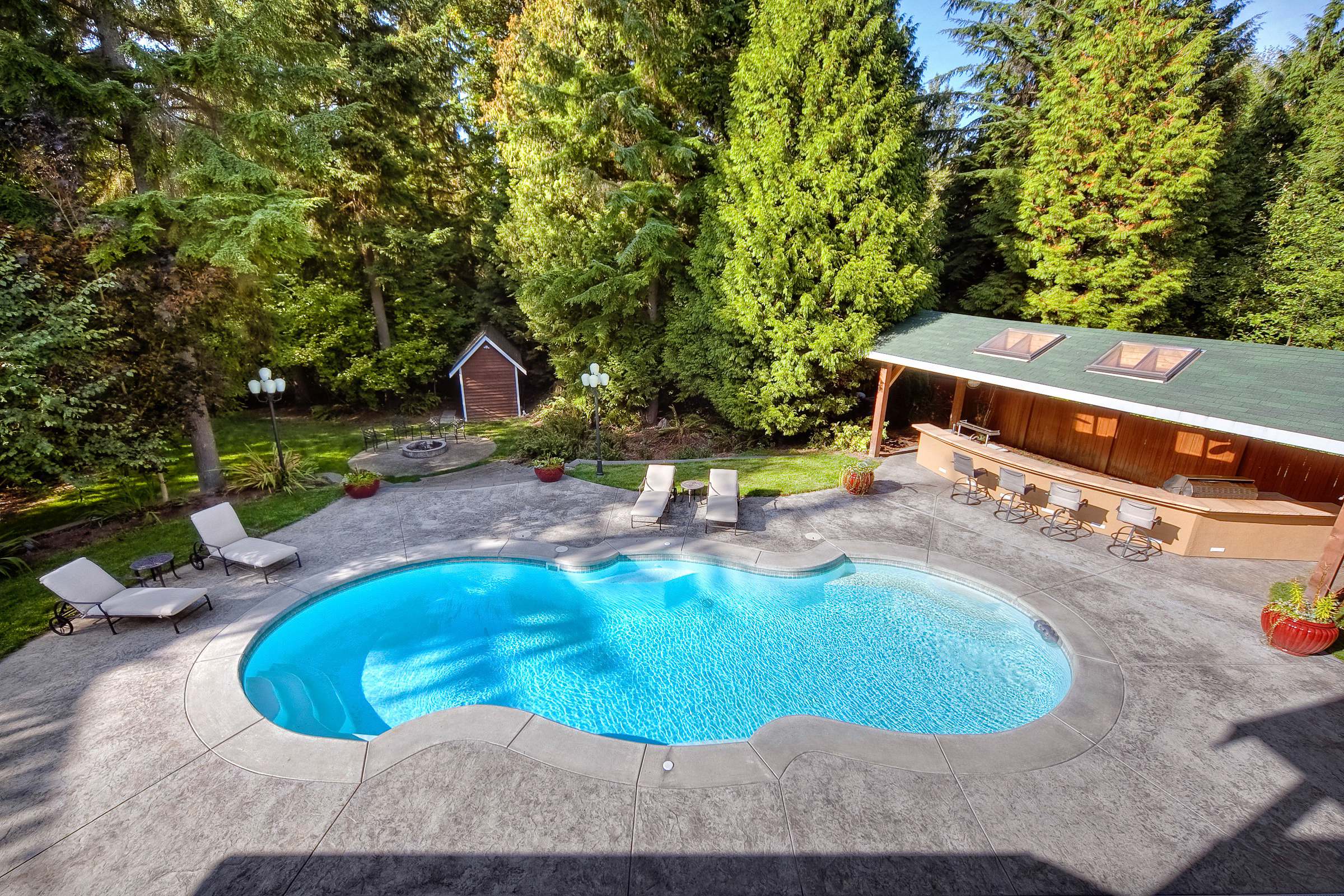 Outdoors, the home unfolds into a resort-style setting with covered living spaces, pool, outdoor kitchen, and expansive grounds, complemented by a substantial outbuilding with garage, workshop, media space, and room for guests or hobbies.