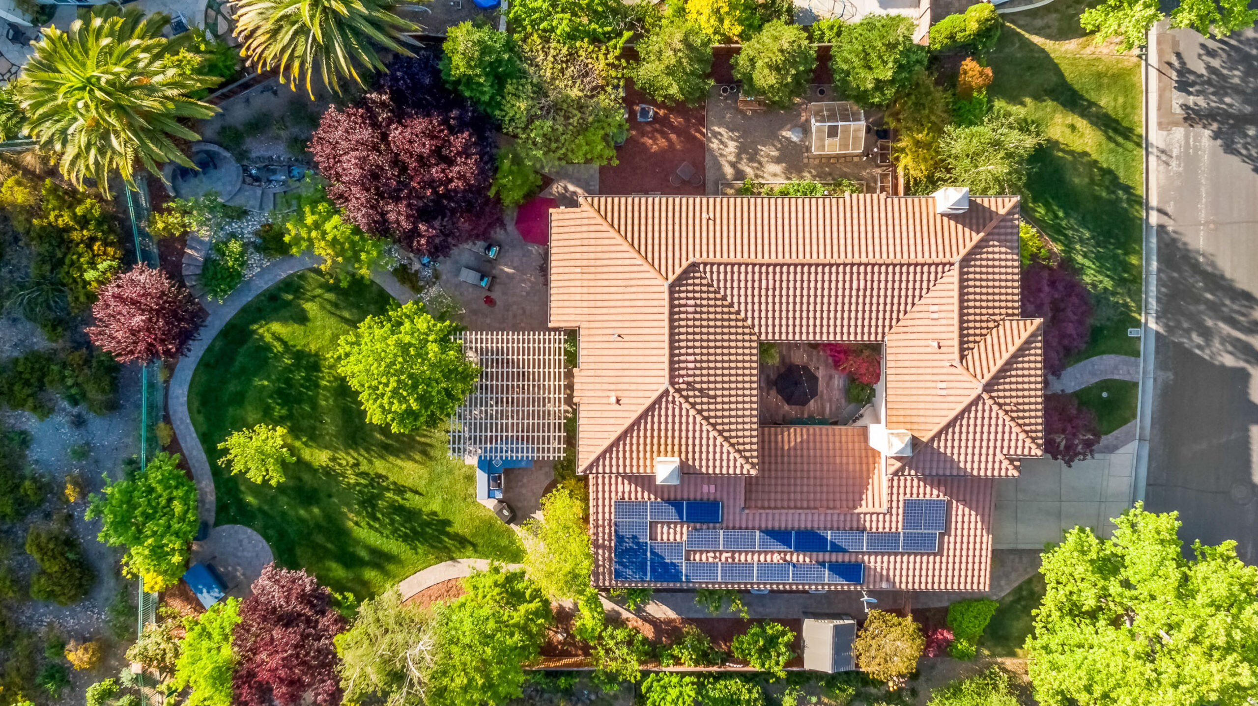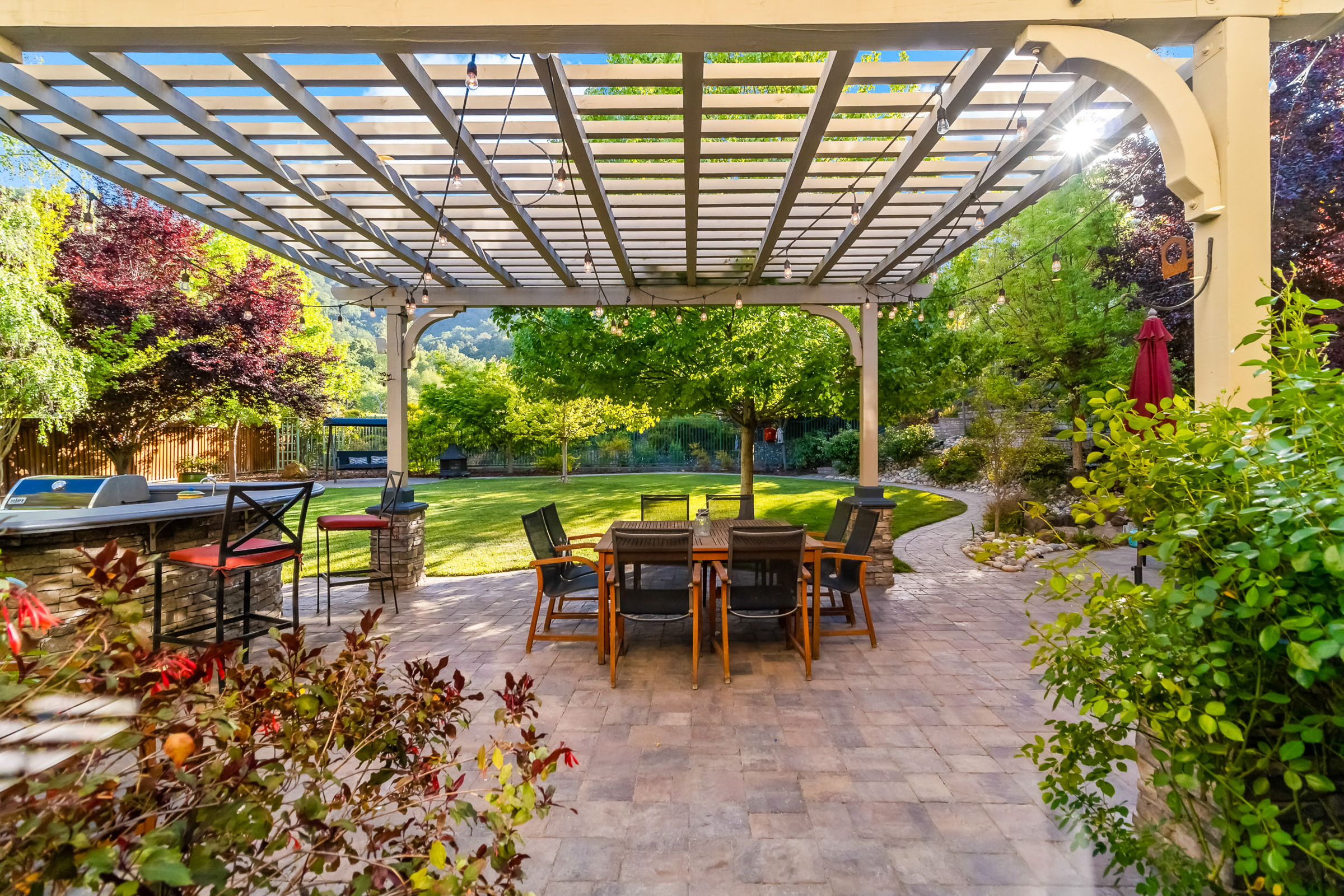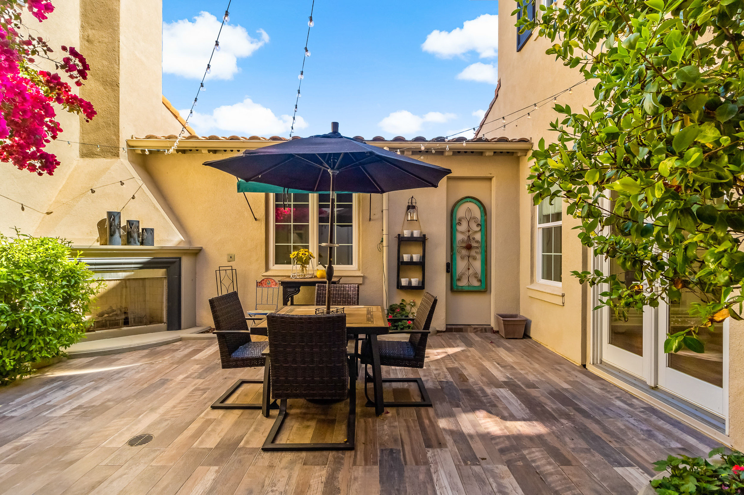 At the center of the home, a private courtyard with fireplace creates a serene indoor-outdoor connection, while the professionally landscaped grounds offer terraces, gardens, and sweeping golf course views.